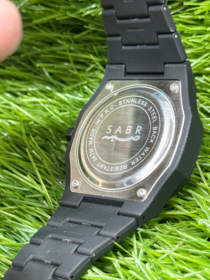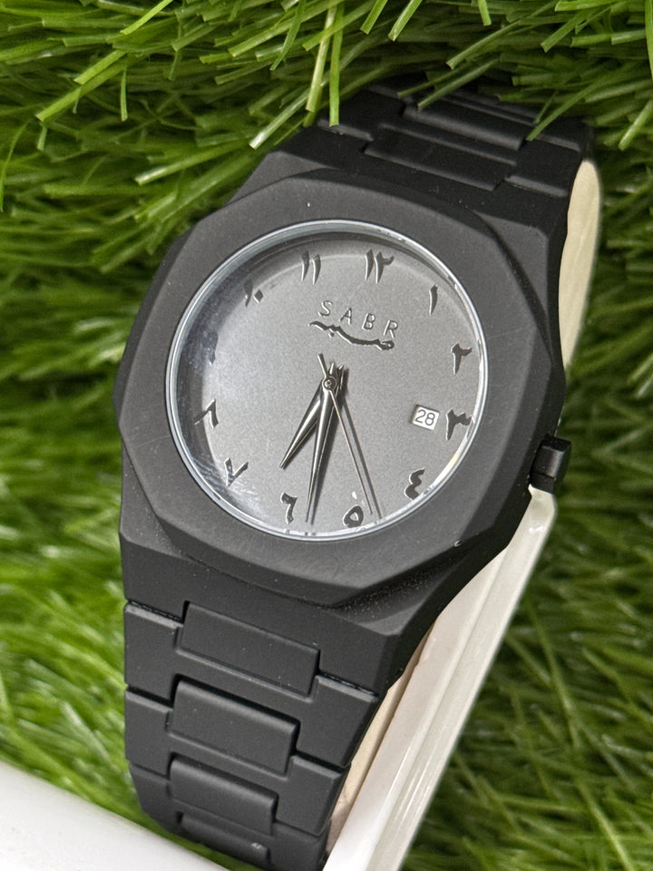The Aura Watch is a sleek and modern timepiece, complete with a date feature and the word "Sabbar" written on the dial. Stay punctual and stylish with this expertly crafted watch.