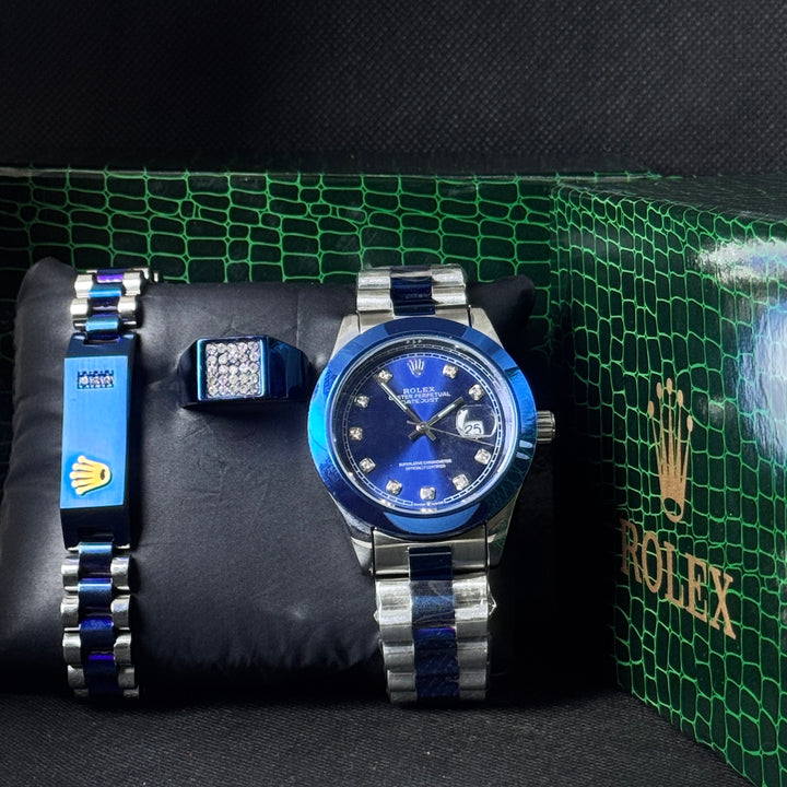This stunning ROLEX DEAL BLUE AND SILVER COLOUR watch is a must-have for any fashion-forward individual. The elegant blue and silver color scheme is complemented by the matching bracelet and ring, adding a touch of sophistication to any outfit. With this timepiece, you'll exude style and confidence.