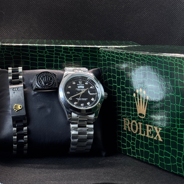 Experience luxury with our ROLEX DEAL SILVER AND BLACK COLOUR watch set. Made of high-quality steel, the sleek silver and black design will elevate any outfit. The matching bracelet and ring add a touch of elegance. Upgrade your style with our exquisite watch set.